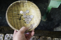 ![]() お金をザルに入れて清水で洗います。北条家のころから伝わる方法だとか ![]() 「御寶銭」を分けていただきました。火打ち石を打ってから手渡してくれます ![]() 「洗ったお金は大事に使いましょう」と貼り紙が。何に使うかが問題ですね