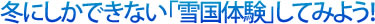 | 冬になると日本のほぼ半分近くの地域が雪に覆われる。「寒い」と閉じ籠ってしまうか、「雪で遊ぼう」と外に出て雪体験するか。遊び好きを自認するなら、多いに外に飛び出して雪体験しよう。 |