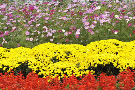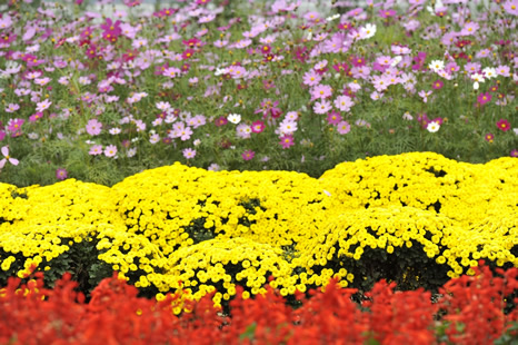 写真Dになる(「絞り」を絞る)に従って、中央の黄色い花の前後の花までシャープになってきているのがわかるでしょうか。