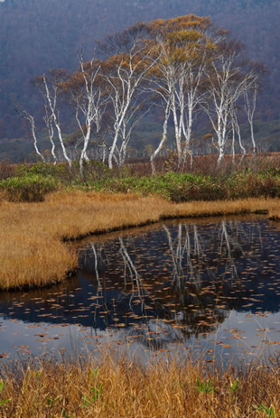 もっともポピュラーなパターンとしては、前後に「写したい被写体」があるケースです。手前にヒツジグサが紅葉した池があって、その背後にはシラカバの木があり、さらにその奥には山肌が見える。このような前後に被写体があって、全体をひとつの風景としてキリッと美しく見せたいとき、「絞り」を絞ることで全体をシャープにします。ここではF11に絞っています。