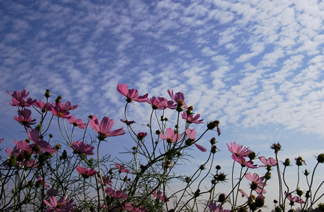 写真Hも写真Eと同じパターンです。手前にあるコスモスと背景とした鱗雲を「絞り」を絞ることでひとつの風景として見せています。絞りはF16です。絞りを開けていたとすると雲は大きくぼけ、シャープな風景写真というよりホンワカとしたイメージ写真になっていたように思います。