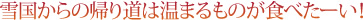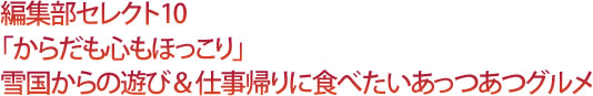 | 雪国に遊びに行く。雪国へ仕事に出かける。そんな帰り道に求めるものは、からだも心もほっこりさせてくれるあっつあつグルメ。自動車道上り線限定で編集部がセレクトした8の温かくておいしい逸品はこれです! |
