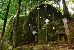 所在地:島根県雲南市大東町須賀260 TEL:0854-43-2906 日本初之宮である「?賀の宮」造営の際、そこから雲が立ち上り、スサノオが詠んだとされる和歌の碑文が須我神社にある。「八雲立つ 出雲八重垣 妻籠みに 八重垣作る その八重垣を」 ![]() 奥宮にある岩座(いわくら)、通称「夫婦岩」。最も大きいのがスサノオ、左手が妻クシナダヒメ、手前の小さい岩が息子ヤジマジヌミといわれる