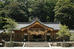 所在地:島根県松江市佐草町227 TEL:0852-21-1148 奥の院の森の中には「鏡の池」があり、クシナダヒメの御霊が水底深くに沈んでいる。縁結びの神として知られ、硬貨を紙に乗せてお供えし、早く沈むと早く結婚できるという。 ヤマタノオロチを退治する際、クシナダヒメを隠す場所として選ばれたのが、斐伊川の川上から七里離れた「佐久佐女(さくさめ)の森」にあり、夫婦が住んだこの宮は八重垣神社となっている。 梅原はこれらの地に残された数々の伝承や事実をつなぎ合わせ、スサノオこそが出雲王朝の初代王であると結論づけている。 そしてその6代目として、古事記に兄弟の神々の従者として大きな袋を背負って登場するのが、オオナムヂことオオクニヌシである。 八十神(ヤソカミ)たちは、稲羽(因幡/現在の鳥取市周辺)のヤガミヒメに求婚しようと、オオナムヂに重い荷物を背負わせて東方の因幡国に向かう。 この旅の途中に挿入される説話が、「因幡の素兎(しろうさぎ)」の話だ。 素兎はワニ(鮫)と八十神に翻弄され、いじめられるのに対し、オオナムヂだけがやさしく兎を介抱する。その結果、ヤガミヒメが結婚相手に選んだのが一番身分の低いオオナムヂであった。 当然、八十神たちの嫉妬は激しさを増す。 兄弟の神々の画策により、オオナムヂは殺されてしまう。 嘆き悲しんだのはオオナムヂの母、サシクニワカヒメだった。母は高天原に参上し、出雲の守護者であるカミムスビに助けを乞う。カミムスビはふたりのヒメを遣わし、オオナムヂを治療し、見事に蘇生させる。 しかし、八十神の迫害は止まらない。 身を案じた母のサシクニワカヒメは、紀伊国(和歌山県)のオオヤビコの元へとオオナムヂを逃がしてやる。 それでも追手がやってくるため、オオヤビコの手引でスサノオのいる根之堅洲国(ねのかたすくに/黄泉の国)へと送ってやるのだ。 黄泉の国では祖先であるスサノオが王であった。 スサノオは、オオナムヂを温かく迎えたわけではなく、いくつかの試練を与える。 そこでオオナムヂの苦難を救ったのは、スサノオの娘であるスセリビメだった。 愛を交し合ったふたりは、スサノオの隙を突き、宝物である太刀と弓矢と玉飾りのついた琴を抱えて逃げ出す。 スサノオは我が娘スセリビメを奪っていったオオナムヂが憎いのだが、その反面、この娘婿がかわいくてしかたがないのが、和歌からありありと伝わってくる。 黄泉の国から帰ったオオクニヌシことオオナムヂは、苦難を克服する強い男に成長していた。 八十神を討つため、オオクニヌシが最初に城を構えたのは、木次町里方の妙見山の尾根筋に位置する城名樋山(きなひやま)であったという。 ヤマタノオロチを退治した、スサノオゆかりの地で挙兵したオオクニヌシは、出雲平野の北部の地を占領して出雲の王となった。 正妻には黄泉の国より連れてきたスセリビメを迎えたが、最初の妻であった因幡のヤガミヒメはスセリビメを恐れ、因幡へと帰って行った。 ![]() 熊野大社