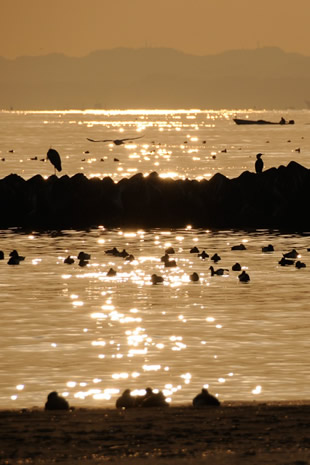 写真C・Dは、水辺に集う冬鳥たちを昼間に順光で狙った写真と、夕暮れ時に逆光で狙った写真です。