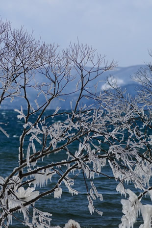 どちらの写真も福島県猪苗代湖湖畔の駐車場で撮影した植栽に付いた氷の写真です。前日までの強い風にあおられて、波飛沫がかかり凍り付いたようです。