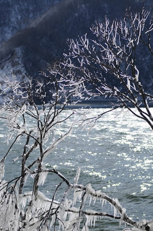 完全な逆光とはなっていませんが、逆光気味に撮ることで、木に付いた霧氷や川面から立ち上る川霧が際立って見えるのがわかっていただけるかと思います。