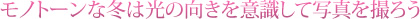 実は、「逆光」で撮ることは、冬に限らずどんな季節であっても、写真をより立体的にメリハリ強く見せる撮影の基本です。