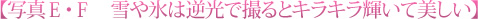 氷や雪は、「逆光撮影」の格好の被写体です。逆光で撮ることで、キラキラと輝いて見えるからです。写真E・Fはその具体例です。