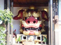 ![]() 旬な魚介類の並ぶ店頭。威勢のよい掛け声に押されてつい買ってしまいます ![]() 波除稲荷神社。有名水産企業が奉納した提灯がたくさん架かっていました ![]() 金箔がまぶしく、そのなかでお歯黒が目立つ「お歯黒獅子」が立派です