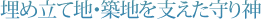 大きな神社を想像している人には驚くほど敷地も小さい神社ですが、その所縁は前述のとおり、江戸の埋め立て事業に欠かせないほどの影響力をもっていました。 鳥居をくぐると左右に「獅子殿」と「摂社・弁財天社」があります。獅子殿に鎮座するのは重さ1トンにもなる厄除け天井大獅子。御本社創建とときを同じくして祀られた摂社にはちょっと珍しい「お歯黒獅子」があります。紅色の肌にお歯黒を施し、金箔押しの巻き毛と、堂々たる姿を見せています。 そして、いかにも食・魚介類の市場らしいのは、さまざまな“塚”が境内にあること。 「魚がし碑」は魚がしが築地に移転してきたときの奉納碑で、大正14年4月に建てられています。 「玉子塚」は平成5年に東京鶏卵加工業組合が創立三十周年を記念して建てたもの。テリーさんのお兄さんをはじめ、築地にはたくさんの玉子焼き店があるのだから、当たり前かも。 「海老塚」は昭和48年に「東天会てんぷら料理協同組合」と「海老の大丸」によって建立。やはり、毎日新鮮なエビを料理してますから…。 「すし塚」は昭和47年に東京都鮨商環境衛生協同組合が建立。そのほかにも「鮟鱇(アンコウ)塚」「活魚塚」などがあります。 これらはお魚を扱うプロたちが建てたものです。 しかし、お寿司やお魚料理が大好きな人も、この神社でパワーを授かるだけでなく、お魚さんの供養をしてもいいかもしれませんね。 |