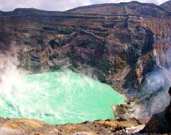 ![]() 噴火口には高熱の温泉水が溜まり、もうもうと湯気が立ち昇っています