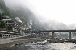 ![]() 横参道には14カ所の水基があり、訪れる旅人も気軽に水を汲むことができます ![]() 1000年以上の歴史をもつ杖立温泉は川沿いに旅館が並ぶレトロ感たっぷりの温泉地です