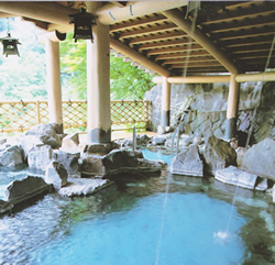 ![]() 庭園を望む「石楠花の間」の客室露天風呂。現在は信楽焼の浴槽にリニューアルされている。内湯を含め全館温泉かけ流し。