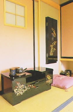 ![]() 「信玄公岩風呂」へと続く渡り廊下が温泉への期待感と旅情をかきたてる ![]() 部屋を引き立てるテーブルや鏡台など蒔絵の漆家具は女将のこだわりだ