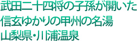 中央自動車道・勝沼ICよりJR中央線塩山駅方面へ向かう。線路を越えたら国道140号線を西沢渓谷・秩父方面に向かって20分ほど走ると川浦温泉山県館の大きな看板が見えてくる。途中、ぜひ立ち寄ってみたいのが、国道140号線手前にある恵林寺(えりんじ)だ。ここは夢想国師が開山した、武田信玄公の菩提寺。信玄公が生前に対面でその姿を写させたという等身大の不動明王や、夢想国師の築庭は必見。毎年4月12日には信玄公の供養が行われており、家臣の墓約70基も墓所後塵に並ぶほど由緒ある禅寺だ。