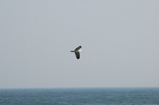 海岸で飛んでいたカモメを狙ったものですが、白いカモメに対して白い空ではカモメは目立ちません(写真F)。