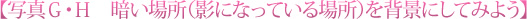 しかし、明るい被写体を暗い背景で撮影すれば、撮りたい被写体が浮かびあがります(写真G)。