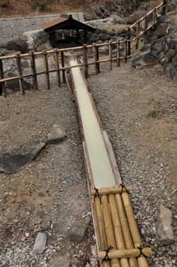 ![]() 5番源泉から約100mほど上がったところにある10番源泉。樋を伝うことで硫化水素ガスは揮発し、湯が適温に冷まされる。