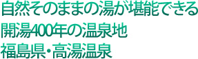 | 福島県高湯温泉は、古くから「奥州三高湯」と謳われ、その薬効が広く知られてきた。平成22年、東北で初となる「源泉かけ流し宣言」を採択。自然の中にたたずむありのままの湯小屋は、後世に伝えるべき希少な温泉となっている。 |