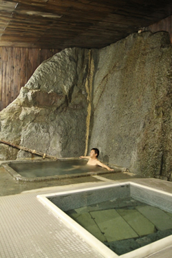![]() 湯底からはぬるめの湯、浴槽横の岩からは熱めの湯が湧く。それが混じって適温となる(甲子温泉)
