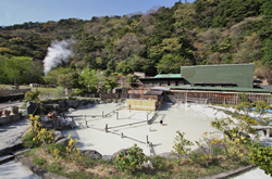 ![]() ここは地獄。大露天風呂の湯底からは温泉と鉱泥が一緒に湧き出す。美容研究家注目の白い泥だ(別府紺屋地獄)