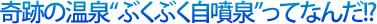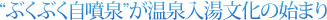 | お風呂はどんなときでも気持ちいいのだけど、やはり日本人なら温泉が格別。最近では“源泉かけ流し”でないとイヤとか、“白濁りの湯”がいいという、温泉の質にこだわる人も増えた。なかでも奇跡の湯と呼べるのが究極の上質湯“ぶくぶく自噴泉”。至福の温泉時間を体験してみてほしい! |