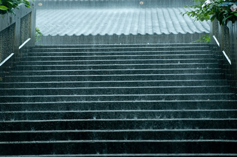 写真Eは激しく打ち付ける雨足を狙ったものです。1/40秒を選んで撮影しています。流れる雨と階段に打ち付ける雨の様子がこの日の雨足の強さを表しています。