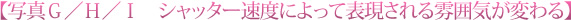 写真G/H/Iは、同じ滝の水流を1/250秒、1/30秒、1/4秒とシャッタースピードを変えて撮影したものです。