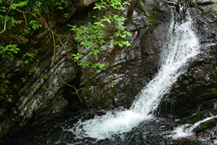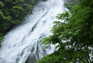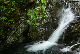 前者(写真A)は低速シャッター(1/4秒)で滝を撮影したものです。水の流れの様子や勢いはなくなりますが、滝を“流れるなだらかな白筋”としてとらえ、初夏の森の清々しさを表現してみました。