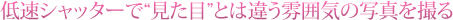 低速シャッターで雰囲気を変えるケースとしては、渓谷の流れの美しさを表現する場合、岩場に打ち寄せる波の荒々しさを表現する場合などがあります。