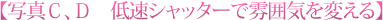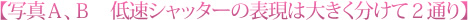 ひとつは動いているものを長時間かけて表現することで、雰囲気を変えるケース(写真A)。一方は光の動きの跡(光跡)をとらえて作品にするケース(写真B)です。