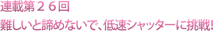 「オート設定」でカメラ任せにするのではなく、シャッター速度を調整してさまざまな写真に挑戦しましょう。今回、越カメラマンが教えてくれるのは、「低速シャッターの極意」です。低速シャッターで大胆なカットをものにしてください。