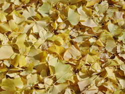 黄色く色づいた葉が輝き、逆光で背後の山やイチョウの幹が陰になり、画面全体が引き締まって見えます。