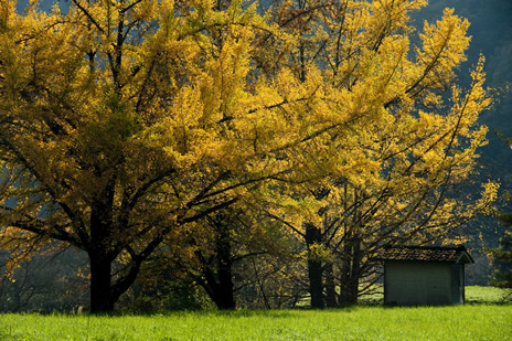 写真Kは、長野県南部を走っているときに見つけたイチョウの木です。木の下には小さな小屋もあり、とても雰囲気があったので、逆光気味に光が入っている向きにカメラをセットして撮影しました。