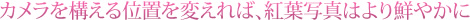このようにカメラを構える位置をひと工夫するだけで、見違える写真になります。ぜひ、秋の紅葉撮影で実践してみてください。