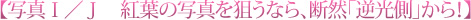 ちなみに紅葉の写真をうまく撮るコツは、逆光気味に撮影し、陰になる部分と輝いた葉を巧みに生かすことです。そのためにも、カメラポジションを色々と変えて撮影するのが大切になってきます。
