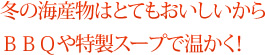 とくに海の温度がぐっと低くなる冬期は、寒さ対策のためにアブラが乗るから、魚介類のおいしさが一段と増す季節。アウトドア好き、豪快に食べるバーベキューやみんなでつつく大鍋料理が好きならば、寒いこの季節の旬は見逃せない。