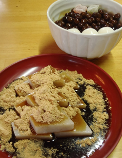 たっぷりのきな粉と秘伝の黒蜜をかけたくず餅は、200年前から変わらない味です。