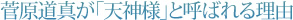 もともと「天神」とは雷の神様ですが、菅原道真が祀られる全国の神社は「天満宮」「天神社」などと呼ばれ、今日では菅原道真=天神様という構図で知られています。