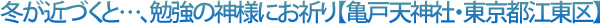 寒い季節は受験生にとって追い込み時、机に向かう時間も長くなります。そんな受験生たちの心の支えになっているのが「天神様」でしょう。俗に全国に1万社(実際は4000社弱という説もあります)、江東区の亀戸天神社も訪れる人が絶えません。