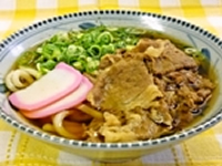 「自慢」の味付けを施した肉が100gもどっさりとトッピングされた評判の肉うどん。おやつには多少重いかもしれないが、満足感は計り知れない。