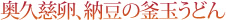 まさに茨城ご当地和風麺の決定版。茨城産の小麦「絹の波」を使用したもちもち麺を釜あげにして、それに奥久慈の卵と水戸の名物・納豆をトッピング。