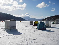 ぼくがスキー雑誌の編集をしているとき、猪苗代周辺はスキー場オープンブームだった。裏磐梯猫魔、アルツ磐梯、グランデコなどのスキー場が相次いでオープンし、しばしば冬の磐梯に行った。そのときに見たのが桧原湖の氷上ワカサギ釣りだった。スキーとは対照的なのんびりとした冬の1日の遊び方に、「いつかは…」と思ったものだ。