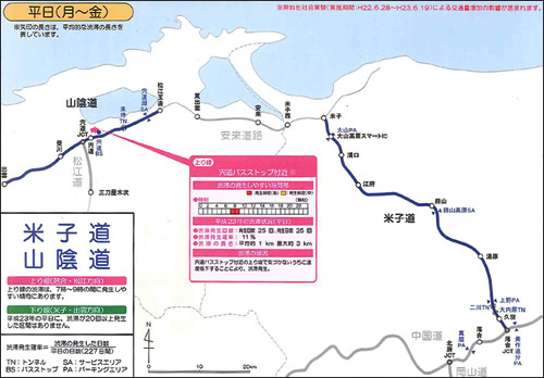 掲載した地図は山陰道のものだが、穴道バスストップ付近では平成23年に25回渋滞が発生(発生確率11%)、平均約1㎞、最大約3㎞、理由はバスストップ付近が上り坂で気づかないうちに減速したため、と非常に具体的なのだ。
