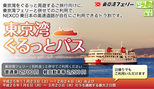 NEXCO東日本が現在推しているプランがこれ。東京湾フェリーを利用して東京湾をぐるっとまわるお得なパス。三崎港でマグロ料理を楽しみ、捕鯨が頭数限定で許可されている房総半島の和田浦でクジラ料理を楽しむなど、東京湾ドライブを楽しみたい。