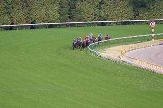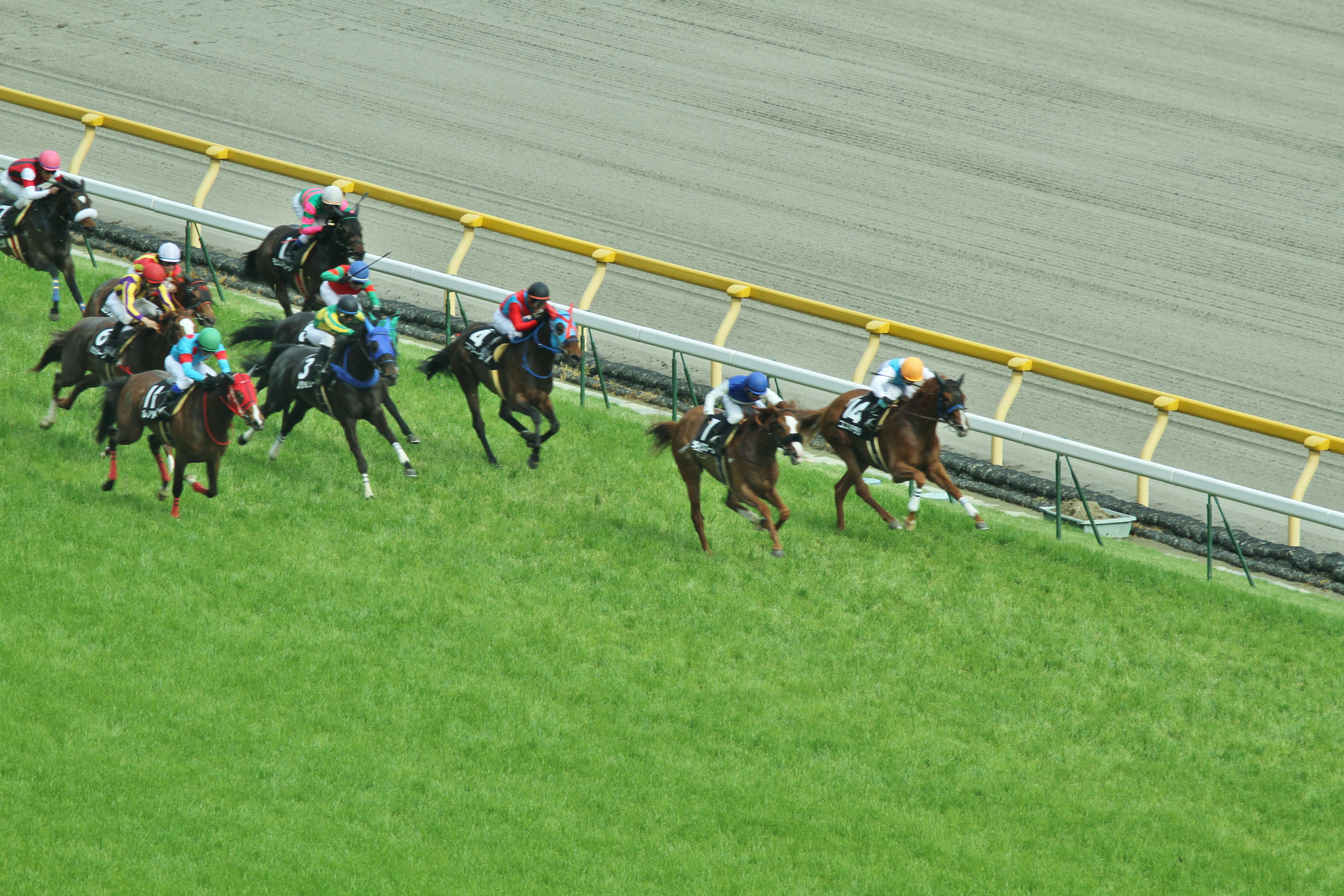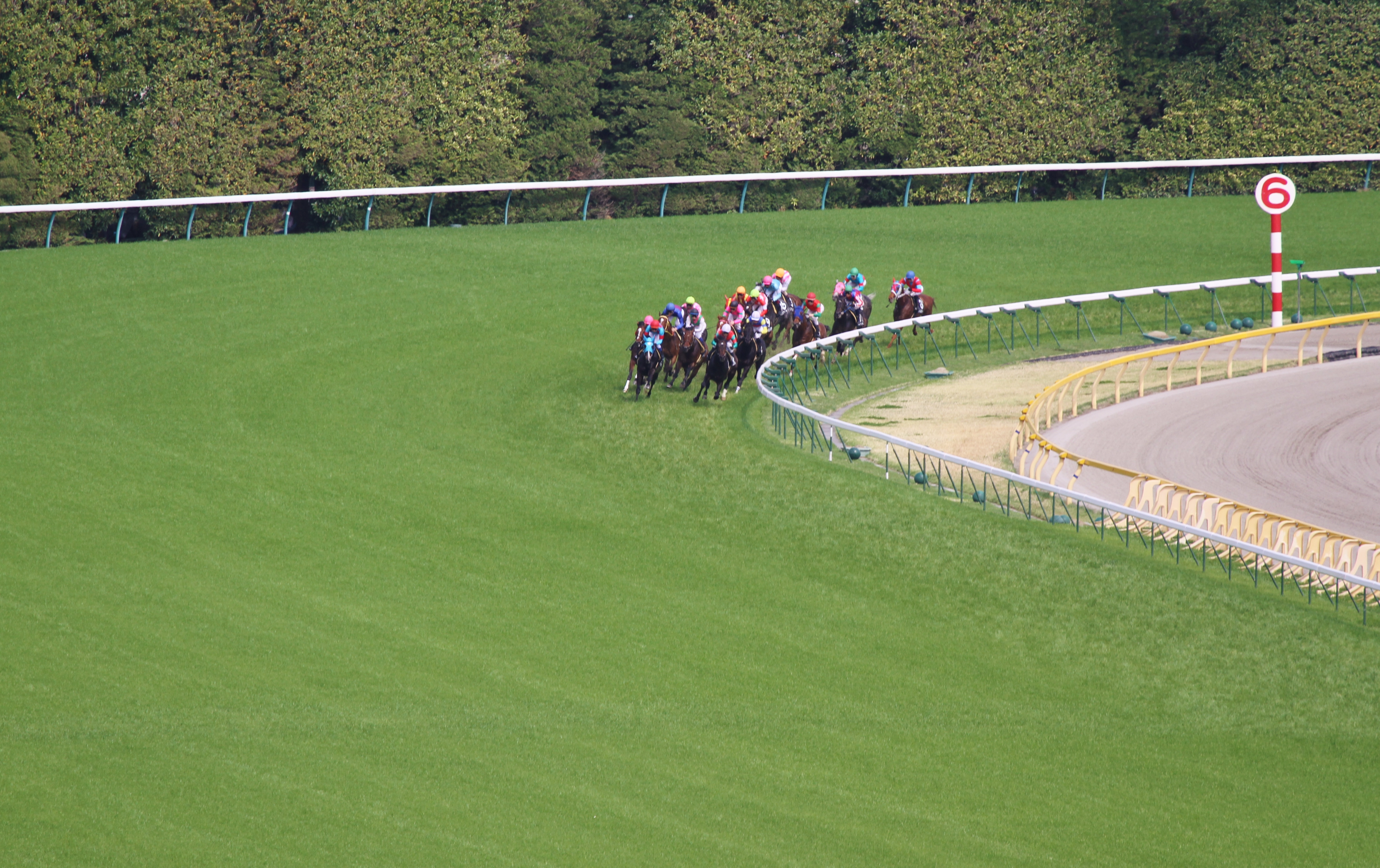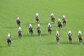 写真はそのとき撮ったものです。馬がアップ過ぎると肖像権などの問題があるので、遠目の写真をセレクトしました。それでも、緑のターフと駆けるサラブレッドが美しく、印象的でした。