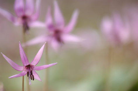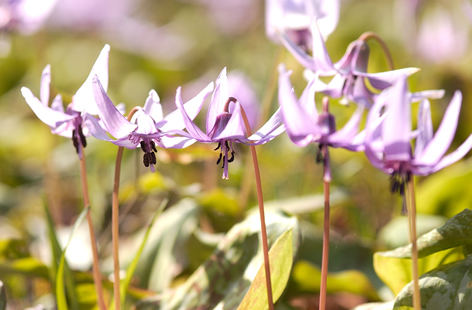 地面に点在して咲くカタクリなど、ポイントを絞りにくい被写体は、その中でも狙いやすく形のよい一輪に注目し、ピントを合わせることがポイントです。