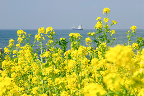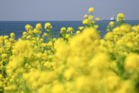 写真Eは手前にナノハナのボケを入れ、遠くの海上を行く船にピントを合わせています。この場合、船行く海が春を迎えたという季節感を盛り込んでいます。