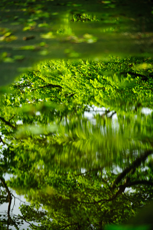 写真Kは、コンクリートの道路に溜まった水たまりです。見た目には、水たまりに緑色が映っているだけの場面ですが、ピントの位置を水たまりに写った木に合わせると、ユニークな絵が浮かび上がってきました。
